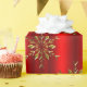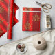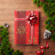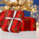 En röd julklapp i eleganten med mönster av glansigt guld snöflingor (eller julstjärnor) som är spridd över en metallröd bakgrund för att ge lite elegans och stil till din julklapp som är inslagen i december.