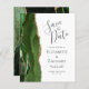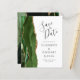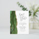 Det moderna bröllop spara datum-kortet från den lämnat kant i eleganten har en vattenfärgad jägare i grönt i gräns som trimmas med faux guld glitter. Med anpassadet kombineras grått-handskrift, tryckplåt och kursivt typsnitt på vit bakgrund. Den omvända sidan har en matchande jägare-grönt och guld-agate-design.