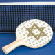 Den här eleganten och den enkla designen användor en guldstjärna av David, både som bakgrundsfärdigt mönster och en enda större Magen David i förgrunden. Du kan ta bort någon av de här funktionerna och bara ha det upprepade mönster eller den centrala stora stjärnan genom att klicka på anpassa eller anpassa. Det är lätt.