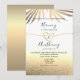 Enkel, elegant, sandstrand bröllopsinbjudan med vackert folierat rep hjärta och jättegula palmblad. Perfekt val för moderna sommarbröllop.