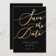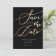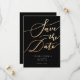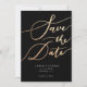 Elegant och enkel bröllops inbjudan. Den handskrivna typografin är i falskt guldglitter mot en svart bakgrund.