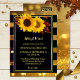 Inbjudan till elegant bröllop med solblommor, höst löv och guld blommigt snurrar på en svart och mousserande guld-strimlad bakgrund. På baksidan finns en QR-kodmall som du enkelt kan anpassa eller ta bort om du inte behöver den.
