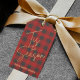 "Det här är årstexten i ett faux guld-folie och namn i chic är skrivet på dessa röda och grått buffalo-pläterade märkre i mönster, perfekt för alla helgdag tillfälle.