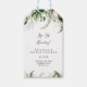 Dessa gyllene tropiska gröna sip sip hooray presentkort för bröllopsfest är perfekta för en modern bröllopsfest. Designen har handmålad akvarell guld och gröna palmer och bananblad med rosa blommor snyggt arrangerade i vackra buketter.