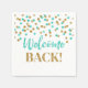 Välkomna tillbaka napkins med turkos och Guld konetti mönster.