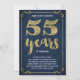 Denna svindyra och stilfulla inbjudan till 55-års bröllopsdag har vintage-typografi, eleganta utsmyckningar, penselskrift-kalligrafi, falsk guld-folie och en chic marinblå bakgrund.