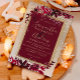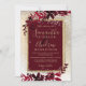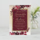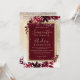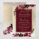 En modern, chic och elegant guld typografi Blommigt röd burgundisk vinterfestinbjudan till julbröllopspartiet med handmålad rödfärgad löv blad på en chic gult guld med vit snö och snöflingor.