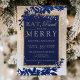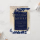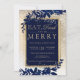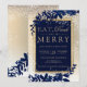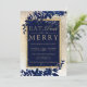 Ät, drick och var snäll! En modern, chic och elegant guld typografi Blommigt marin blåfärgad julfestinbjudan med handmålad blåfärgad löv blad på en chic gult guld med vit snö och snöflingor. Perfekt till jul eller bröllop.