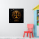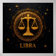 En lysande guldfärgad illustration av Vågen stjärntecken, med vågskål och intrikata ornamentala detaljer på svart bakgrund. Representerar balans, harmoni och astrologiska teman, perfekt för andlig eller dekorativ användning.