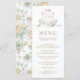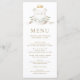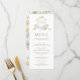 Elegant bröllop-menyn med en vintage vapensköld med monogram. Vänd över kortet för att visa ett vackert blommönster med fjädrar i påsen.