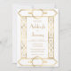 Den här vintage-inspirerade bröllopsinbjudan innehåller guld-färgad-text på en vit bakgrund, framtagen av en snyggt vintage-geometrisk konst deco gräns i faux guld-folie. Den omvända sidan är helt vit.