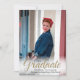 Vit dimma-effekt med vacker guldmönstertext "Graduate" med ett fullständigt täckande foto på framsidan och relevanta detaljer om examensfesten på baksidan.