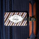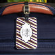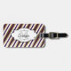 Särdrag för denna glimmar härliga bagagemärkre diagonala randar för look av guld, vit, och lilor på både beklär och drar tillbaka med områden som du kan skräddarsy med ditt namn och den initiala, såväl som telefonnummer eller fulla adressen för efternamn.