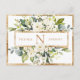 Eleganta krämfärgade och elfenbensvita blommor omgivna av vacker frodig grönska. Fram- och baksidan pryds med brudens och brudgummens namn och monogram i gyllene färg. Guldtrim ger denna skönhet en elegans som är det bästa. Rakt underbart. Budget postkort.
