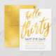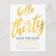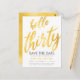 Elegant 30-års födelsedagsfest "Spara datum" vykortdesign med stor typografi i guld och anpassad text.