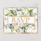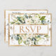 Elegant kräm och elfenbensblommor omgivna av vackra lush grey och guld-fläckar. Typografi framför "OSA". Baksidan visas med OSA och namn av brud och groom. Guld och stänk avslutar denna skönhet på bästa sätt med elegans. Bara vackert. Budgetvykort.