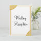 Bröllopsmottagning skrivs i elegantens svarta skript mot skarp vit bakgrund. Tvåtonad guld-färg-geometrisk gräns och faux flap-skalopad kant för ett modernt elegantkänsel. Stor Monogram på tillbaks i guld färg-skript. Anpassa mottagningsdatum och detaljer. Utformning av TamiraZDesign.