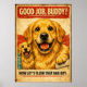 Två glada Golden Retriever levererar uppmuntran med en rolig twist. Den slitna retrodesignen, i kombination med djärva röda och blå badrumskakel, gör denna affisch både charmig och rolig. En perfekt present till hundälskare, familjer eller alla som vill att deras badrumsdekoration ska ge en glad stund.