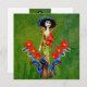 Guld och blå antik Catrina över en grön tvättad yta. Figuren är stiliserad och elegant, med en klänning i guldtoner och en blå volang som sträcker sig åt sidorna. Hon bär en elegant utsmyckad hatt också i koboltblått. I sina armar bär hon en vacker bukett röda blommor. Fira Dia de los Muertos eller De dödas dag med denna boho-design inspirerad av mexikansk konst.