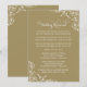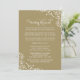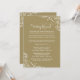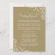 Tillsätt värme och elegans till er repetitionsfest med denna vigselrepetitionsinbjudan i guld. Vit scrollningsutsmyckning accentuerar hörnen medan flödande kalligrafi presenterar en charmig rimmad dikt som guidar gästerna från ceremonipraktik till middag. Den rika guldskugga bakgrunden skapar en lyxig men välkomnande känsla. All text, färger och layout är helt anpassningsbara för att matcha er fest.