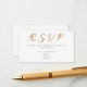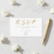 Det här moderna svarskortet har en krävande vit bakgrund och texten "RSVP" i sofistikerad, guldpräglad skrift, och erbjuder en fräsch och enkel design för moderna bröllopsevenemang. Det tydliga och lättlästa formatet låter dig inkludera viktiga svarsdetaljer, såsom plats, kontaktinformation och ett personligt meddelande till gäster och familj på baksidan. All text är helt anpassningsbar, vilket gör det enkelt att koordinera med din unika bröllopsstil samtidigt som kommunikationen med gästerna hålls elegant och okomplicerad.
