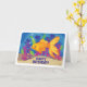 En guldfisk från finare i ett akvarium med ljusa färgader och sand. Färg omfattar orange, blått, lila, tan och rosa. Det här födelsedagskortet är perfekt för alla som kärlek fiskarnas hobby. Inuti: Tom