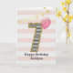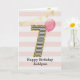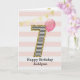 Födelsedagsfödelsedags kort i guld och rosa för flickor, som du kan anpassa med hennes namn. Framsidan av detta vackra födelsedagskort för henne har siffran sju i en svart-vit rand med en kontur av glitter med en rosa ballong som är redo att flyta iväg. Observera att glittret är en designeffekt och att det inte kommer att finnas något verkligt glitter på detta födelsedagskort. Bakgrunden är en mjuk vit och rosa med en guldbanner högst upp. Det är lätt att anpassa meddelandet på insidan om du vill. Ett unikt 7-års födelsedagskort för barnbarn, dotter, systerdotter osv.