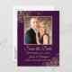 Låt dina vänner och familj veta att de ska spara datumet för ditt kommande bröllop med detta enkla men eleganta vykort. Det har en vacker design med guldtext på en djup plommonlila bakgrund, och ditt foto omgivet av luftiga guldkrullar och virvlar. Baksidan har en söt grafik som lyder "skriv in oss" och utrymme för en anpassad anteckning.