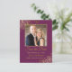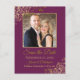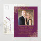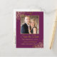 Låt dina vänner och familj veta att de ska spara datumet för ditt kommande bröllop med detta enkla men eleganta vykort. Det har en vacker design med guldtext på en cassis lila eller magenta färgad bakgrund, och ditt foto omgivet av luftig guldblommig filigran. Baksidan har en söt grafik som lyder "skriv oss i din kalender" och utrymme för en anpassad anteckning.