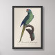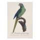 Denna eleganta illustration visar en livfull parakit som graciöst sitter på en böjd gren, utförd i den förfinade naturalistiska stil som förknippas med Jacques Barraband. Konstverket, med titeln La Perruche à front rouge, visar upp en minutiös uppmärksamhet på fjäderdräktens detaljer, med rika gröna toner som dominerar kroppen, kontrasterad av en slående rödorange panna och blåaktig hjässa. Fågelns långa, avsmalnande stjärt och böjda näbb är karakteristiska för parakiter, vilket betonar både balans och anatomisk precision, typiskt för sent 1700-tal till tidigt 1800-tal inom ornitologisk illustration.