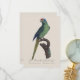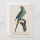 Denna eleganta illustration visar en livfull parakit som graciöst sitter på en böjd gren, utförd i den förfinade naturalistiska stil som förknippas med Jacques Barraband. Konstverket, med titeln La Perruche à front rouge, visar upp en minutiös uppmärksamhet på fjäderdräktens detaljer, med rika gröna toner som dominerar kroppen, kontrasterad av en slående röd-orange panna och blåaktig hjässa. Fågelns långa, avsmalnande stjärt och böjda näbb är karakteristiska för parakiter, vilket betonar både balans och anatomisk precision, typiskt för ornitologiska illustrationer från slutet av 1700-talet till början av 1800-talet.