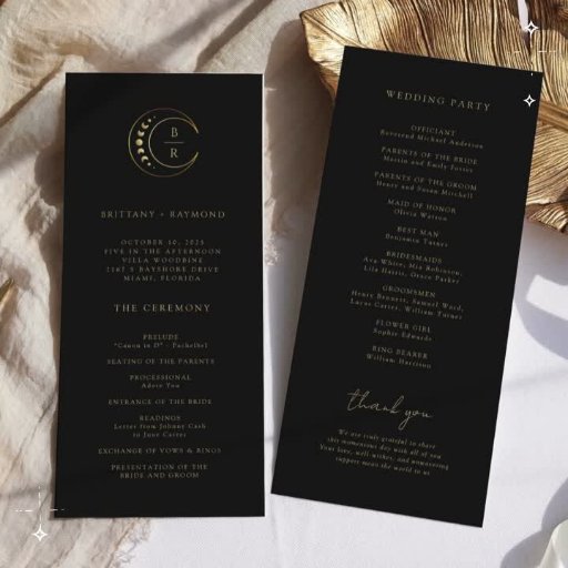 "Guldmånebröllopets inklusionskort" är ett himmelskt viskande mot en djup svart bakgrund, som sömlöst kompletterar din inbjudan. Den gyllene halvmånen, stjärnorna och månfaserna skapar en harmonisk komposition, medan det stilrent enkla anpassningsbara initialerna för paret tillför en personlig touch och ger flera lager av symbolik till de detaljer du vill dela.