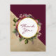 Tack-kort med ett guldmarmormönster och en enfärgad vinröd färg som lagras diagonalt tillsammans. En cirkel med en falsk guldfoliekan överlagrar en vacker blomsterbukett med rosor, nejlikor och andra blommor. Inuti finns orden Tack. Personligt meddelande på baksidan.