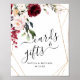 Blommig bukett i burgunderröd och rosa nyans med guldgeometrisk form som ramar in texten "kort & presenter" och klassisk typografi för bröllopsskylt.
