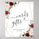 Blommor med burgunderröd och rosa blomsterbukett och guld geometrisk form som ramar in "kort & presenter" och klassisk typografi för vigselskylt.