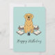 Fira födelsedagen för en älskad elev, författare eller läsare med detta charmiga gratulationskort med tema Golden Retriever. Med en fantasifull illustration av en glad, briljantbärande Golden Retriever omgiven av öppna böcker och ett bläckhorn, förmedlar detta kort en kärlek till lärande och litteratur. Den mjuka opalfärgspaletten och det eleganta "Grattis på födelsedagen"-manuset skapar en mjuk och sofistikerad känsla, perfekt för att önska en nära och kära en glädjefylld och minnesvärd födelsedag. Detta kort är ett idealiskt sätt att uttrycka dina varma önskningar till någon speciell som uppskattar det finare i livet, som en bra bok och en lojal följeslagare.