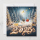 Fira det nya årets magi med detta fantastiska kort, som visar en snötäckt skog upplyst av varma gyllene ljus. Ett lysande "Godt nytt år 2025"-meddelande är vackert ingraverat i snön, omgivet av festliga dekorationer, skimrande presenter och hoppande gyllene rådjur.