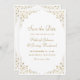Detta eleganta vintageinspirerade formella bröllop spara datum-kort har texten i guldfärgad script- och serif-teckensnitt, inramad av en delikat vintage guld vinstocksmotiv. Ramen upprepas på baksidan.