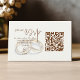 Gör RSVP-svar enkla och minnesvärda med detta vattenfärgade bröllopsringar QR-kodkort. En elegant, handmålad illustration av två guldringar som symboliserar evig kärlek sitter i hjärtat av den rustika, romantiska designen. Mjuk vattenfärg ger konstnärlig charm och en känsla av värme, medan det moderna tillägget av en tydlig QR-kod innebär att gästerna kan bekräfta sin närvaro och få tillgång till alla evenemangets detaljer med sina smartphones. Denna funktion som sparar tid effektiviserar RSVP-hanteringen och gör det enkelt för både dig och dina gäster. Perfekt för par som vill kombinera enkel, modern bekvämlighet med traditionell symbolism och vacker pappersvaror, är detta kort en höjdpunkt för alla lyckliga bröllopsfiranden som kombinerar tid