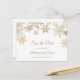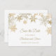 Jul tema bröllop spara datum vykort med guldsnöflingor. Perfekt för eleganta vinterbröllop och andra säsongs- och högtidsfiranden.