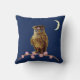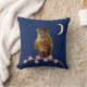 Mode gulduggla, rosa blommor och halvmåne på marinblå soffkudde. Den gyllene ugglan står på en blommande trädgren.