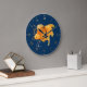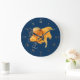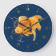 Väggklocka med romerska siffror med svansguld fisk, roder och ankar nautisk illustration på marinblå bakgrund.