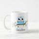 Personligkopp som lite presenterar en sitta för blåtttecknaduggla på en gren med gröntlöv och blåa blommor. Rolig design för flickor och kvinnor. Anpassadenamn.