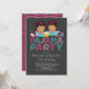Gullig sleepoverpartyinbjudan som presenterar tvilling- flickor för en afrikansk amerikan på en kudde med en bunke av popcorn, pizza och makeupobjekt som är fastställda på en flott svart bakgrund. Vår stilfulla, moderna & roliga pajamapartyinbjudan för tvilling- flickor har sparretypografi att låta i rosor, turkosblått & tänder precis - rosor. Bläddra vår slummerpartyinbjudan över för att beskåda en koordinerande sparrerandbaksida för ett extra speciellt handlag. Perfekten för en tweenfödelsedagsfest eller tonåring födelsedagsfesten.