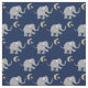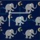 Detta härliga tyg presenterar ett gulligt mönster av elefanter för grått lite med en playfully lyftstam och fot på midnatta blått och att växla med guld- gula stjärnor och måne.