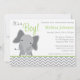 En modern inbjudan för baby shower för grått- och gröntelefant themed. Perfekt för en pysbaby shower.