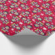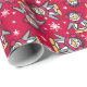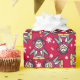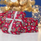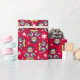 Gulliga pingvinfåglar klädde varmt med en scarf och gå i ax värmeapparater på en röd snowflakebakgrund. Den festliga grafiska mönstrade julen som slår in papper idealför barn för gåva åldras allra, i rött, vit, och guld- gult och grå färg skuggar.