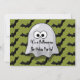 Svart flygfladdermöss med glödande ögabakgrund mot nedgånggrönt är perfekta för dessa Halloween födelsedaginbjudan. I läskiga brev läser den den är en Halloween födelsedagsfest på bekläda mot en gullig ungespöke med stora google ögon. Baksidaen har att matcha oliv grönt bakgrund med att matcha bokstäver för ditt personligbarns information om den Halloween födelsedagsfesten.
