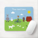 Gullig mousepad/mousemat med tecknaddjur (get, åsna, fjäril, hundar och valpar som jagar en katt) och en pojke som rider en cykel. Skräddarsy texten för att passa dina behov, genom att klicka på ", skräddarsy den" knäppas - laddar av färger och typsnitt för att välja från.