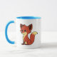 En blått- och vitmugg med en gullig röd, brun och kräm- kulör tecknadräv för le med pointy öron och en stor buskig svan.